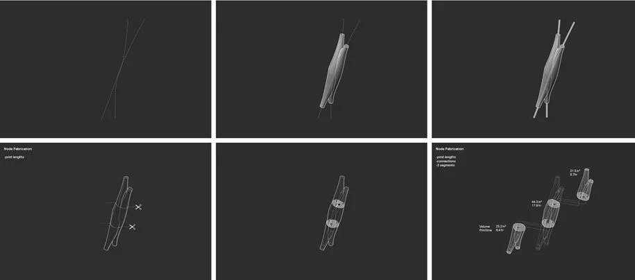 The Mangrove Structure is an ultra- lightweight composite construction assembly that takes advantage of two complimentary material systems for its basic character and organization. The first is a networked system of bending-activated structural elements made from engineered pultruded glass-fiber reinforced plastic (GFRP) rods at a diameter of 3/8”. Bending-active members gain compressive strength when held in bending. These elements are sprung into a network of structural shapes through a second complimentary network of complex node and floor connections. This second system is comprised of custom digitally designed node clusters that are manufactured through state-of-the-art digital modeling and 3D printing techniques. There are twelve nodes in the installation. Each has been engineered, shaped and subdivided to suit 3D printing materials and tolerances, while providing adequate structural support for the system.