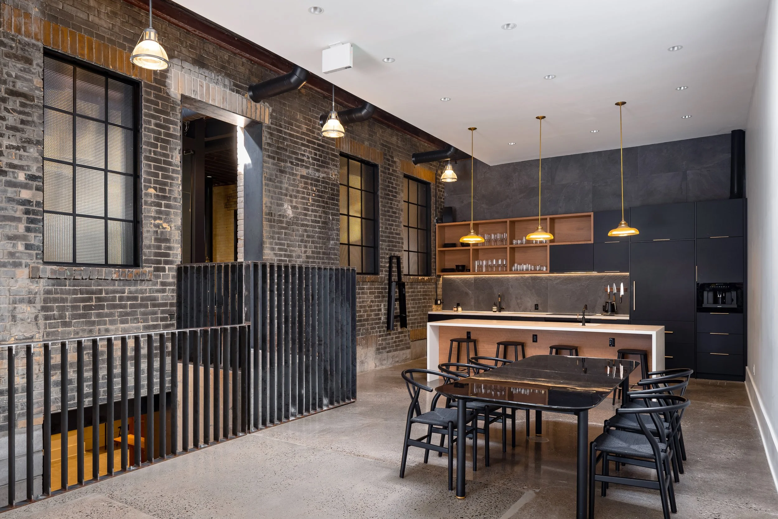 The office is now characterized by three distinct zones: client hosting, a hot-desk work station, and an open staging area, each with its own adjoining social space. Hosting takes place on the main floor of the heritage building, where a glass-walled meeting room is a bold contemporary intervention in the historic space. New mullionless windows and skylights direct natural light through the meeting room and deep into the rear lounge, which offers staff a casual place to unplug, and connect socially. In the lower level, the traditional office space is surrounded by breakout meeting rooms and a collaborative roundtable. Finally, we created a flexible prop and costume staging area in the open plan of the adjacent building, and added a communal kitchen that supports lively shared meals in the office.